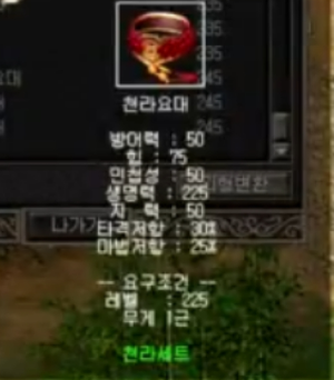 천라 요대는 힘 75 민첩성 50 생명력 225 지력 50 타격저항 30% 마법저항 25%퍼를 올려주고 전체적으로 스텟은 공요쪽을 따라가는 느낌이 좀 있었습니다.