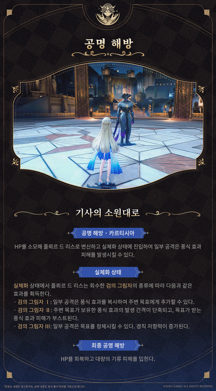 - 변신: 공명 해방(R) 사용 → 플뢰르 드 리스 상태 진입 (HP 50% 소모).